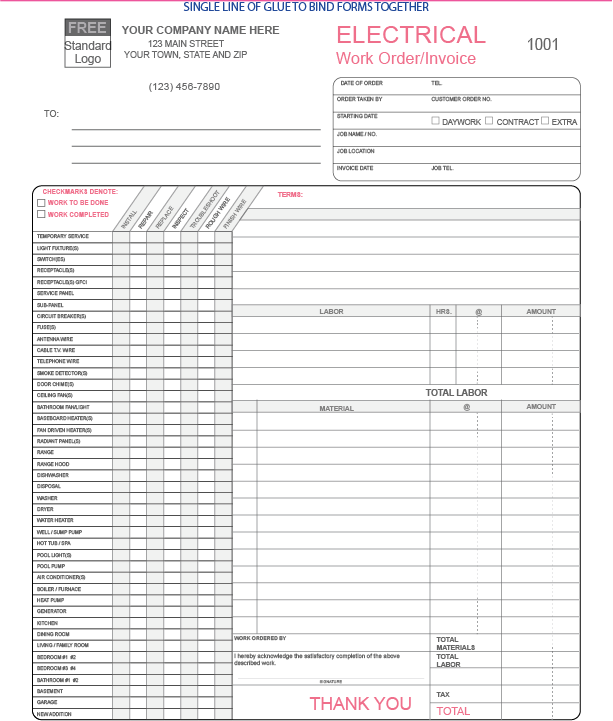 Business forms are typically printed on NCR© or carbonless paper, which gives the business owner a copy, along with the customer having their own copy. They are typically duplicate or triplicate forms, where the third copy would be for accounting purposes for instance.